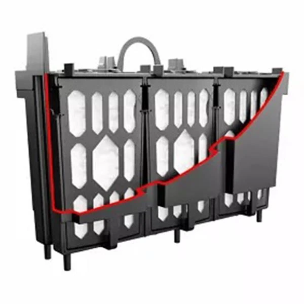 Filtre muhafazası ile akvaryum camı arasındaki tüm temas elemanları kauçukla korunmaktadır. Kauçuk ayaklar titreşimlerini azaltır ve filtre muhafazasının çarpmasını veya titreşiminiortadan kaldırır. Kasanın üstüne doğrusal delikler eklenmiştir. Bu sayede filtrenin içindeki titreşim etkisini azaltır.