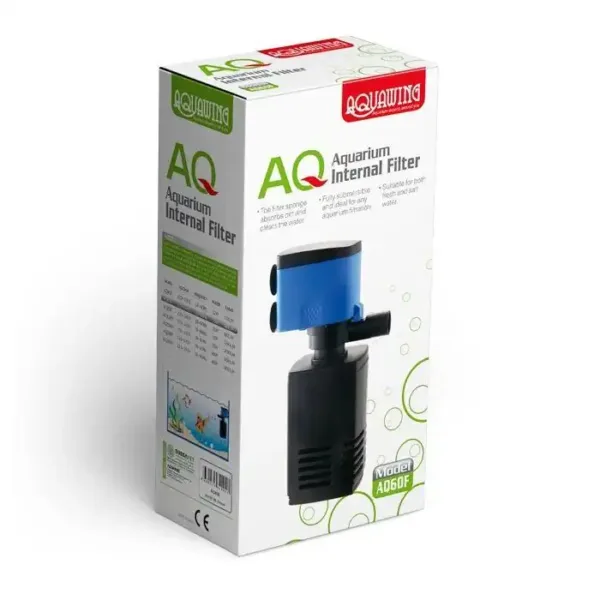 Aquawing AQ60F İç Filtre, küçük hacimli akvaryumlar için geliştirilmiş, yüksek performanslı, sessiz ve güvenli çalışma yapısına sahip bir iç filtre sistemidir. 15W elektrik tüketimi ile 80 litreye kadar olan akvaryumlarda etkili biyolojik ve mekanik temizlik sağlar.