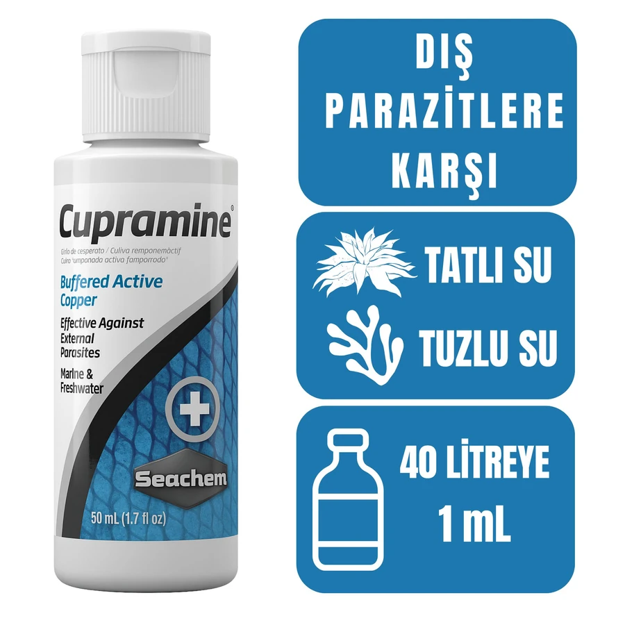 Seachem Cupramine 50 ml dış parazit balık ilacı, bakır bazlı formülüyle tatlı su ve deniz akvaryumlarında dış parazit, mantar ve protozoalara karşı etkili temizleme sağlar.