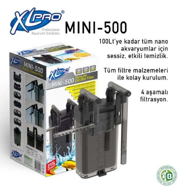 XLPRO 500 mini dış filtre, 510 L/H debi ve 5 sepetli filtrasyon sistemiyle 100 litreye kadar akvaryumlar için kompakt, güçlü ve verimli dış filtre çözümüdür.